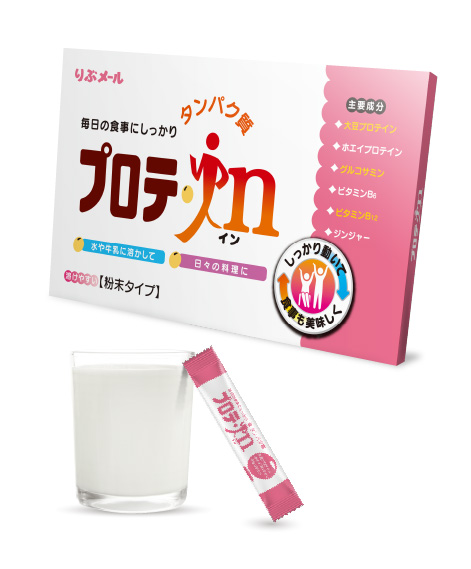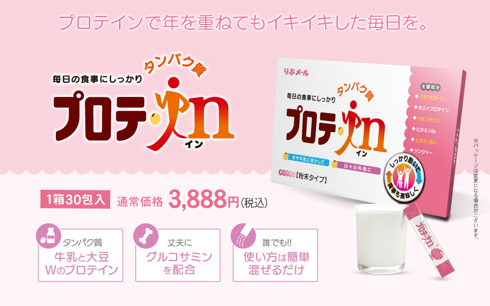 動物由来のホエイプロテイン、植物由来のソイプロテイン、グルコサミンなどが配合されたプロテイン。適切なたんぱく質を手軽に摂取できます。イキイキした生活をサポートします。